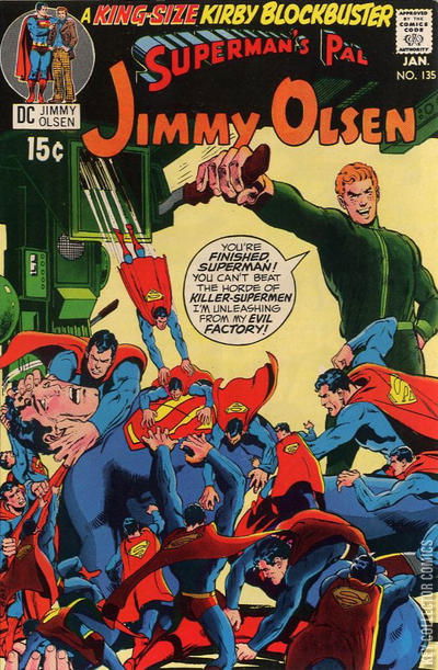 Cover by Neal Adams."Evil Factory!" written and penciled by Jack Kirby, inked by Vince Colletta. (Jimmy Olsen) Reprinted in Jimmy Olsen: Adventures by Jack Kirby and Jack Kirby's Fourth World Omnibus #1. Darkseid creates an evil Jimmy clone."The Hairies -- Super-Race -- or Man's Second Chance" written by Jack Kirby. Reprinted in Jimmy Olsen: Adventures by Jack Kirby. 1 page text article about the Hairies.