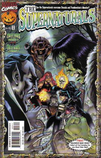 The team is tossed through time to face different foes. Satana and Werewolf battle Dracula, Frankenstein's monster and werewolves at Dracula's castle. Black Cat and Ghost Rider fight witch hunters with protectors Scarecrow and the Headless Horseman. Gargoyle battles zombies and El Chupacabra, while Brother Voodoo tries to save his brother and parents from fearful villagers and the Chaos! Event. But none are successful. Includes a Halloween mask.