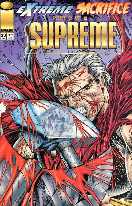 Extreme sacrifice part 2: After his battle against his own evil clone ( Legend of Supreme volume), Supreme is thinking about the modern world he has discover after his 50 years journey and the lost of his powers.But suddenly, someone attackshim. Despites the protection of Mojlnir, the hammer who gave him his powers, his opponent, called Crypt, is able to hurts him and his great speed prevents Supreme to defend himself effectively. Going farther,Crypt teleport Supreme back to Earth and plan to kill Supreme under the eyes of the humans he has promise to protect.Even on Earth, Supreme is powerless against Crypt and after a few more strike, Crypt breaks Supreme's back and throws his corpse in a alley before teleporting himself.Spawn is led by humans in this alley but he only discovers Supreme's cowl.continues in Bloodstrike #18.