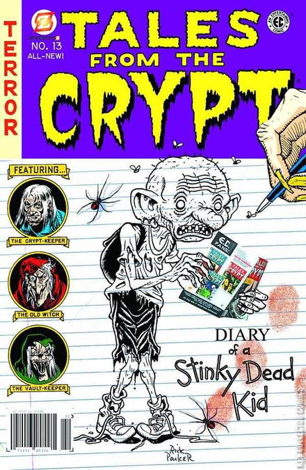 You'd expect something extra-special from the terrific thirteenth all-new issue of Tales From The Crypt, and you'd be right! Presenting a special horrific take on the best-selling kid's series since that other kid graduated Hogwarts! It's "Diary of a Stinky Dead Kid"! Stinky Dead Kid gets involved with yet another super-popular trend, when his favorite simulated guitar-playing game becomes possessed by a deadly demon! Yes, the Stinky Dead Kid meets Guitar Demon! Of course, the Crypt-Keeper, the Old Witch, and the Vault-Keeper are back as well, spinning yet another tale of terror too scary to even mention here!