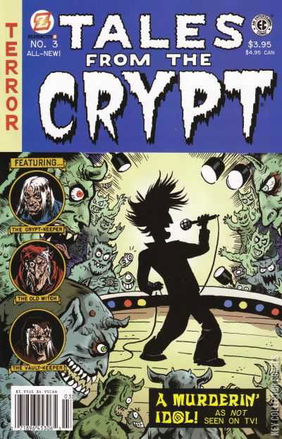 The premier pulse-pounding horror comic is back with all-new petrifying, picto-fiction parodies of today’s pop culture! “A Murderin’ Idol” by “Monsters Attack!” writer Mort Todd and artist Steve Mannion reveals shocking secrets behind the top-rated TV talent contest. Find out how far someone is willing to go to win it all! “Slabbed!” by “X-Files” writer Stefan Petrucha and artist Don Hudson takes a look at the dark side of comics collecting. When Derrick tries to sell his stolen comic to a dealer, he finds out what comics are really worth, and it’s not anything listed in the Overstreet Price Guide! Creepy introductions by the Crypt-Keeper, the Old Witch, and the Vault-Keeper, insCRYPTed by writer Jim Salicrup and drawn by “Beavis and Butt-head” artist Rick Parker.