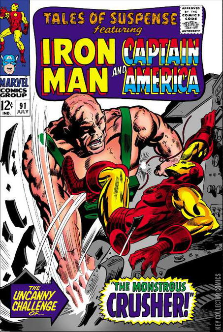 Iron Man Story- "The Uncanny Challenge of the Crusher!"At the start of this issue, Tony Stark is testing a centrifuge machine, which can build up centrifugal force in objects. Declaring it to be complete, he gets a small mouse, and decides to test his centrifuge machine on it to see if he can increase it's weight and density. At the same time, in some South American country, a man only known as Mi Professor declares that he has finished his experiments, and demands to be taken to El Presidente. The professor is taken, and offers a small vial of liquid to the president, saying that it is the ultimate weapon. The president suspects a trap, and so makes the professor drink it. However, the professor says that president should have trusted him, as his body grows rock-hard and his strength increases. Mi Professor then declares that he is the Crusher.The president tries killing the Crusher, but is unsuccessful. The president then orders the Crusher to kill Iron Man, saying that if he does he will be declared the general of his army, whilst secretly hoping that Iron Man kills the Crusher. The Crusher accepts, suspecting the president's deception, but thinking that he can defeat Iron Man anyway. Not long afterwards, Iron Man is attacked, and finds that most of his attacks are futile against the Crusher, whilst the Crusher's strength is enough to make him a match for his armour. Iron Man manages to reach his centrifugal force ray, and increase the Crusher's weight so that he falls through the and through the Earth because of his massive bulk. After the battle, Pepper and Happy come in, and tell Tony that they've decided to elope.Captain America Story- "The Last Defeat!"In the previous issue, Captain America swore to serve the Red Skull for a full 24 hours, in order to stop the Skull from destroying New York City. By now the time is almost up, and the Skull asks Captain America where the world's newest atomic submarine is, since the Avengers were told the location. Cap reluctantly...