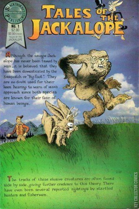 Stories, art and cover by Robert L. Crabb. Another funny-animal spoof from the creator and publisher of Hamster Vice. Junior, a mythical jackalope (a jackrabbit with antelope horns) has wacky adventures that also provide sly commentary on American society as it existed in the 1980s. Professor Von Crabman explains the Pedigres Leapusalopus, or jackalope; The connection between the jackalope and Bigfoot; Junior Jackalope meets Beaver and the kamikaze Suicide Squirrel. So, What IS a Jackalope?; The Wilderness Camp of Wild Jackalope Dan McCoy; Roots; The Jackalope....Friend of Big Foot?; Junior and the Beaver: Sticks an Stones; Junior Jackalope: Squirrels Before Swine; Survival of the Faddist; Sabretooth Jackalope.