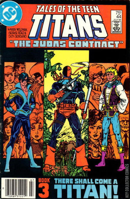 "The Judas Contract" part 3, the origin of Deathstroke the Terminator is revealed! With his teammates captured and betrayed by one of their own, Dick Grayson dons a new costume and a new identity: Nightwing! Continued in TALES OF THE TEEN TITANS ANNUAL #3.