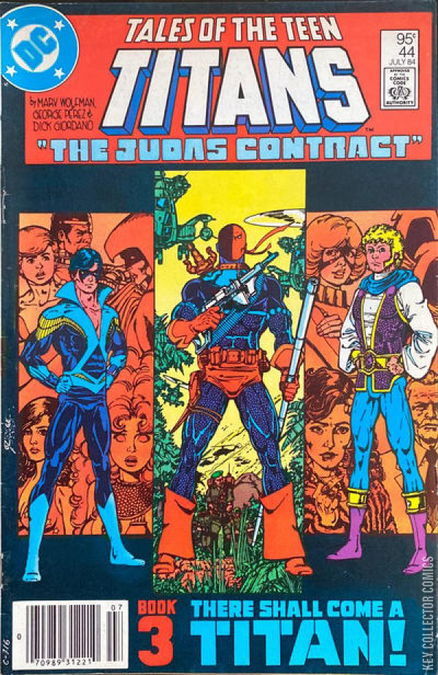 "The Judas Contract" part 3, the origin of Deathstroke the Terminator is revealed! With his teammates captured and betrayed by one of their own, Dick Grayson dons a new costume and a new identity: Nightwing! Continued in TALES OF THE TEEN TITANS ANNUAL #3.