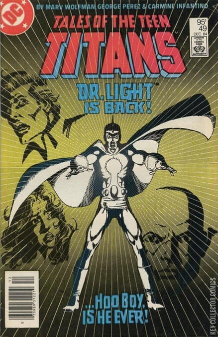 "The Light That Failed" Wally West and Frances Kane take on Dr. Light in "The Light That Failed". Script and co-plot by Marv Wolfman, co-plot by George Perez, pencils by Carmine Infantino and Perez, inks by Mike DeCarlo. Flash (Barry Allen). Letters column includes 1-page illustration of Terry Long and Donna Troy by Perez to set up their wedding in #50. Perez cover. This issue places Central City in the Sun-Belt, a term for the southern United States that border Mexico and the Gulf. Later comics will establish Central City further north, in Missouri.