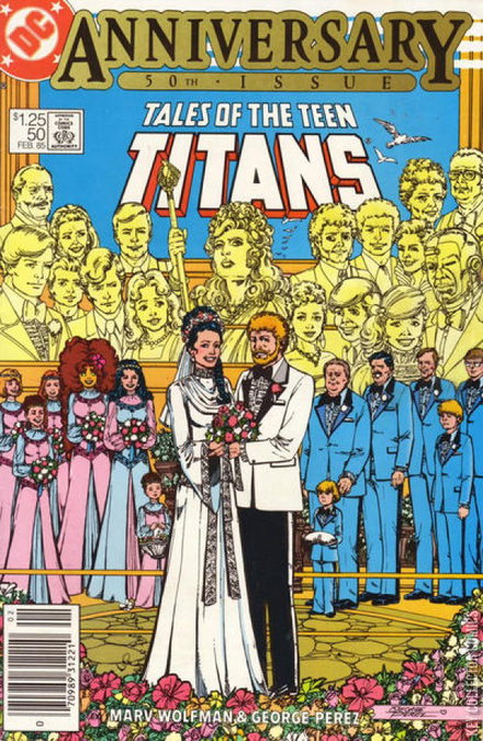 You are cordially invited to the wedding of Terry Long and Donna Troy! Featuring cameo appearances by Superman, Batman and more! 50th issue special! Wonder Girl is getting married and all the golden age Titans and the team's mentors show up for the celebration. Every single member of the Teen Titans, past and present, appears in this issue, except for Gnarrk, whom we learn has died off-panel. Solicited as a January release, but delayed a month, as confirmed by cover date and copyright registration.