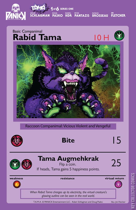 2ND PRINTING! THE VIRTUAL PET THAT WANTS TO KILL ‘EM ALL! PANICK ENTERTAINMENT unleashes its debut title T.A.M.A.. We all had ‘em—virtual pets like Tamagotchis, NeoPets, and Digimon. But what if, after years of neglect, one returned... for revenge? When a grieving, lonely teen stumbles upon an old virtual pet system, he finds comfort. But when gruesome deaths begin to follow, he wonders—could his digital companion be responsible? T.A.M.A. mixes the nostalgia of virtual pets with the generational phenomenon of Pokémon. Interior art by Daniel HDR (Masters of the Universe), Special Cover A TAMA Trading Card Homage Cover by Jim Fletcher
