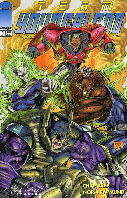 The Liberty II satellite has been taking over by Giger and his cybernetic assassins. Now it's up to Sentinel to assemble an elite team of Youngblood members to handle the situation. Riptide, Cougar, Photon, and Masada stand ready. But when Brahma refusing to answer the call to arms Sentinel must ask the one man he never wanted to see again for help. "Blackout." Story by Rob Liefeld. Art by Chap Yaep and Norm Rapmund.