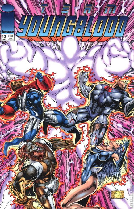 Cover pencils by Chap Yaep, inks by Jonathan Sibal. Untitled story, script by Eric Stephenson, pencils by John Stinsman and Chap Yaep (layouts), inks by Jaime Mendoza; Brahma helps his old teammates in Team Youngblood battle the Never Man. Team Youngblood poster, pencils by John Stinsman. Team Youngblood pinup, pencils by Pedi, inks by Norm Rapmund. Team Youngblood pinup by Gabe Alberula. Photon pinup, pencils by Vince Russell. Team Youngblood pinup by Mike S. Miller.