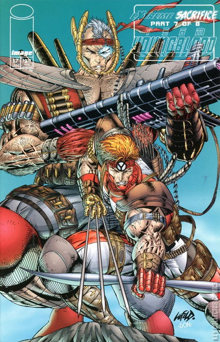 Extreme Sacrifice part 7 of 8. Polybagged with card. Rob Liefeld story. Robert Napton script. John Stinsman & John Fang pencils. Jaime Mendoza inks. Extreme Sacrifice Part 7 (of 8) Graves has gathered every members of Youngblood, Brigade and Newmen he has been able to find as to prepare them for the big battle. Shaft enters the room where everybody is and finds his father, Colonel Bravo, that he hasn't seen in a long time. That's at this moment that Knight Sabre tells shaft that he and his father are part of the Order of the Knights, a group of super-powered heroes that appears when the danger is universal. The meeting is of short minutes as Crypt enters the place, throwing a Warwolf in bad-shape through the window. Link is the first to ripost but his attack is stopped by a newcomer : Newborn, son of Reign and Dash. He seems prepared for this fight since his recent birth as he takes the gem of Reign and sends a blast to Cyrpt. But Crypt is better than that and eliminate him in a blink of an eye. After that, it's a general battle as everybody attack Crypt. Sentinel II receives the hammer stolen from Supreme and seems K.O. The devilish warrior destroys hero after hero and when he is about to finish Dash the surprise arrives. Sentinel II is back and tries to kill Crypt thanks to his fusion reaction. Exit creates a huge portal to send the shrapnels elsewhere as to save his friends but the explosion is too strong. The dust falls and all that Graves and Kombat can see is the whole teams lying on the floor, and Crypt escaping.. .. that's at this very moment that Prophet and Kirby make their entering..