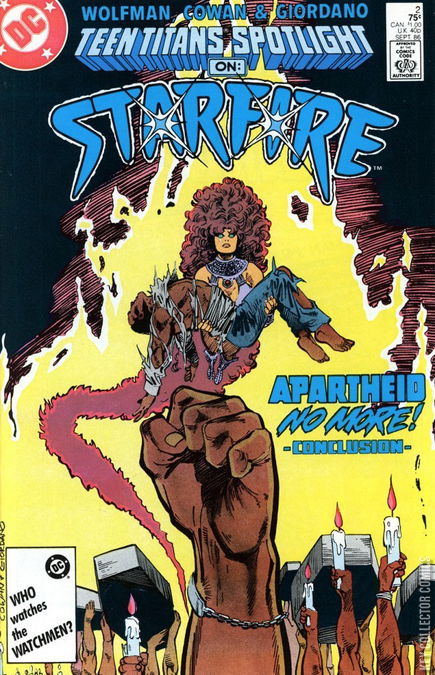 Someone has framed Starfire for the death of a political prisoner. The hero must uncover the plot behind his death before riots break out and tear South Africa apart.