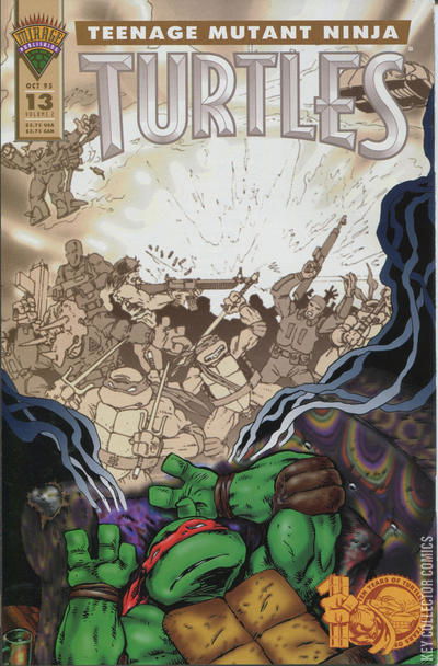 The Battle : The soldiers open fire and Leonardo falls from his perch near the opening - fortunately, Raph catches him. As the guys try to figure what to do, they hear a loud explosion from the surface, and when they peek out they see that the Triceratons have begun their attack on the base. A true maelstrom of violence ensues as the agents of D.A.R.P.A. battles the invading Triceraton forces. The fight doesn't go well for the Triceratons, but the commander aboard the mothership won't recall his troops. Instead, he plans to crash the crippled craft into the surface of the Earth at Warp 8, to inflict as much damage upon the planet as possible and die with what his people consider honor. As the Turtles and their remaining allies prepare to flee, Braunze warns the others that their Triceraton companion is a traitor. The beast fires a blast from its gun that leaves a huge gaping hole in the man's chest. As Braunze lays dying, he informs Leonardo of the Triceraton commander's suicide plan. This news enrages their former Triceraton ally, who refuses to believe that his commander would resort to such a tactic, and declares that the reptilian aliens will soon rule the Earth. As the Triceraton warrior makes his speech, a jet engine falls from the sky and explodes onto him. Braunze's alien friend has the Turtles help him right a Jeep that had been turned over. The fellow plans to go back inside the D.A.R.P.A. base to attempt to thwart the Triceratons from crashing their ship into the Earth. Leonardo attempts to go with his alien compatriot, but a blast of air from the visitor's shoulder apparatus sends Leo flying. The alien tells Leonardo to get his friends to safety as he drives off. The TMNT and Casey retreat to the desert. As the alien drives the jeep, we see that Braunze is seated beside him - the man used his mental powers on the Turtles to fake his death. Braunze and his friend plan to use an "inter-phase cannon" located on the base to move the Triceraton mothership out of phase, causing...