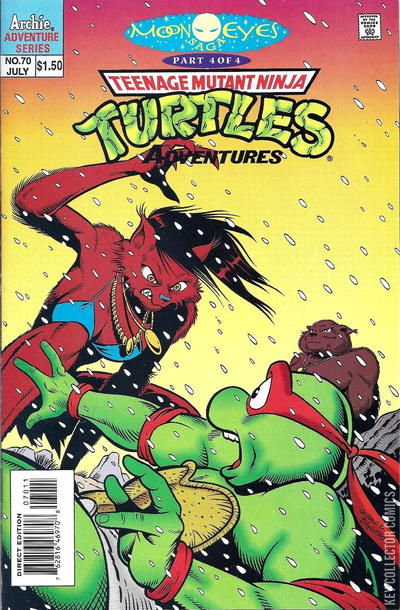 "A Dusk, a Dawn" ("The Moon Eyes Saga", Part 4), plus backup story "North to Alaska", Part 4. As April, Leo, Mike and Don transverse their cave, they discover half buried nuclear waste barrels.Raphael threatens the wolves, but quickly realizes that he should try to retreat. As the ninja backs away, he bumps his head on a stalactyte, which comes loose and conks him on the head, knocking him cold.At Mokoshan's village, the king of the wolvf people explains how his society works to Ninjara. They have no contact with the outside world of modern man, and to surive in difficult times they maintain a heard of caribou in case they cannot hunt in the wild. Mokoshan also tells Ninjara that his people are known by the "ancient" men of the region, the Eskimoes, who came to this area centuries ago from Asia, as did the werewolves. Ninjara explains that her people are from Japan, and that she's thinking about returning there. Mokoshan invites her stay with the wolves until she has fully recovered from her gun wounds - and on cue, Ninjara begins to feel faint. Mokoshan takes her back to her room.April and the guys emerge out the other side of their cave and discover some crazy plant growth. April explains that the government were experimenting with the nuclear waste, to see what its effects on the soil would be. As they walk away, Leo notes that if this is the result of the tests on plant life, he wouldn't want to see what it would do to wildlife... and from the darkness of the cave, two very large eyes peer at the group.Raph awakes inside a room very similar to the one Ninjara is housed in. He's greeted slyly by Revyen, but Raph is angry and jumps out of bed to search for Ninjara. Revyen points out a window, where Raph sees Mokoshan walking with the ninja, his arm around her. Raphael crashes through a window and accosts the werewolf. Mokoshan tries to talk with Raph, but the Turtle is too angry for words and he punches the wolf king. Ninjara cries for them to stop, but the boys continue their battle, as Revyen smiles from the window above.Meanwhile, the werebear is back,...