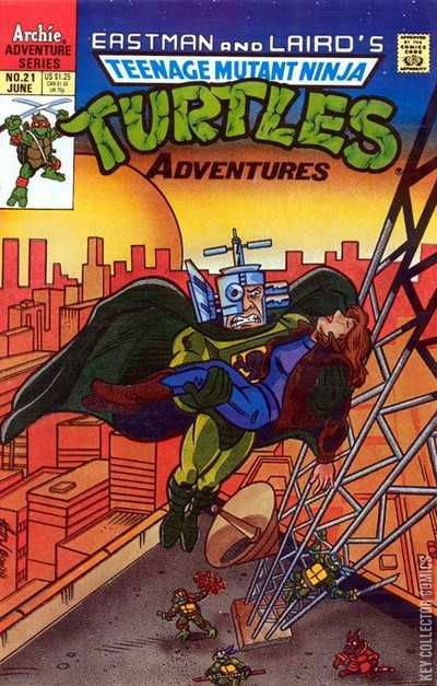 Space Junk, Face Funk, Cyber Punk, Thief : A U.S. spy satellite falls from its orbit and crashes into a pile of U.S.S.R. space junk, becoming entangled with a radioactive canister. The two fuse together in their descent towards the earth below. A man is watching the news in his cabin in the woods and becomes frustrated and angry with all of the reports dealing with mankind's effect on the failing environment. He lifts his TV set and carries it outside, where he tosses it into a garbage can - suddenly, he's struck with a blast of light and energy...Moments later, we see that the woodsman has been transformed. He's now some sort of hybrid between man, television and satellite!" What goes around, comes around," the creature states, "What comes around... goes around!" With that, the cyborg morphs into a ball of fiery energy and flies off. The TMNT are working out in the sewers, still concerned about their missing brother, Raphael. Splinter and April are using the computers at April's news office to do research when one of O'Neil's co-workers arrives. Splinter hides while April has a joyful reunion with her friend, Malcolm, who thought she had been killed. The man asks April if she's investigating the reports of the fallen spy satellite, but O'Neil states that she's interested in something else. Malcolm politely excuses himself so April can get back to work. Splinter wishes to leave, and April sits at the keyboard to save her work - only to be pulled into the screen of the monitor by the cyborg! The Sensei tries to pull April free, but he's too late and is blasted by the satellite dude. Later, Splinter explains to the Turtles what happened. Donatello hacks into the news station's computers, attempting to trace where April was taken. Meanwhile, April is surprised to discover that her abductor is interested in having her interview him. The man states that he's about to destroy the world's communications systems - when April asks why, he tells her to grab her camcorder and he'll explain everything. The fellow stands and explains...