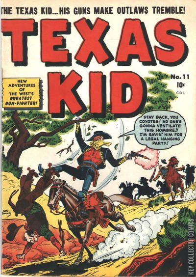 Home / Bell Features / Texas Kid / Texas Kid #11 Bell Features Released October 1951 Texas Kid #11 Add to Collection Want It Synopsis No synopsis available. Issue 2 of 3 Add to Collection Buy it on eBay Buy on eBay Low $25 Mid $75 High $250 Synopsis No synopsis available. Details Series Texas Kid Cover Date October 1951 Pages N/A UPC N/A Cover Price N/A Final Order Cutoff N/A Creators Cover Artist Joe Maneely Price Guide Log in or subscribe to access detailed graded price information and market insights. Log In Subscribe