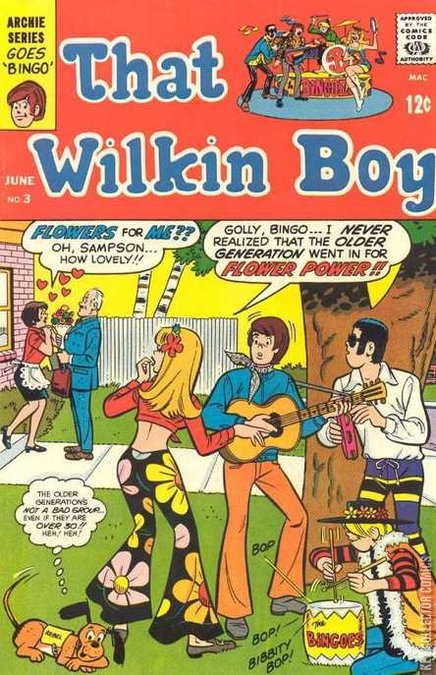 Cover pencils by Dan DeCarlo, inks by Rudy Lapick. Last 12-cent cover price. Generosity, script by Frank Doyle, pencils by Dan DeCarlo, inks by Rudy Lapick; Bingo's group The Bingoes comes over to the Smythe home to practice; Teddy continues to be obsessed with proving that Rebel acts human. Charade, script by Frank Doyle, pencils by Dan DeCarlo, inks by Rudy Lapick; When Teddy tries another scheme to get Bingo away from Samantha, Rebel goes to Samantha to warn her. Dad's Dilemma, script by Frank Doyle, pencils by Dan DeCarlo, inks by Rudy Lapick; Mr. Wilkin wins Mr. Smythe's respect by proving he can lift weights through sheer force of will power; Samantha reveals that her father calls her "Sam" because he wanted a boy, while her father starts to think that Bingo might make a good father for his grandson. Read n' Right! humor page starring Li'l Jinx by Joe Edwards. Drum Rolls and Coffee, script by Frank Doyle, pencils by Dan DeCarlo, inks by Rudy Lapick; Buddy goes to pieces after Mr. Smythe takes away his drumsticks; The gang tries to find him something else to drum with.