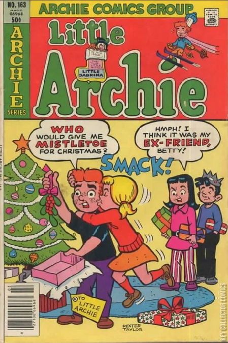 The Christmas Ducks, or Yule Quack Up Over This. Veronica and Sue Stringly get stranded on the old water tower while aiding wayward ducks. Little Archies dog Spotty is in the Andrews car when it gets stolen. Little Sabrina and her aunts help Santa Claus after his sled is struck by a meteor. Stories and art by Bob Bolling and Dexter Taylor. Plus Lil Jinx by Joe Edwards. 32 pages. Cover by Taylor.