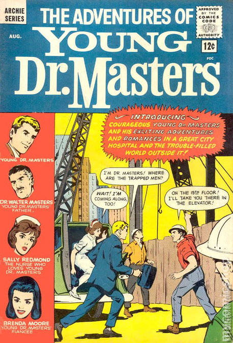 Cover by John Rosenberger. "Dr. Masters' Desperate Decision," script by Robert Bernstein, art by John Rosenberger. Young Dr. Masters and his father spar repeatedly over his preference for research over diagnosis, but his knowledge later saves his father's life. The Nursing Profession: Teen Career Guides article. The Man Who Killed Pain: Great Moments in Medicine article, art by John Rosenberger; The story of the development of painkillers, and Dr. William Thomas Green Morton, a dentist who used ether successfully and encouraged its use at Massachusetts General Hospital in the mid-nineteenth century.