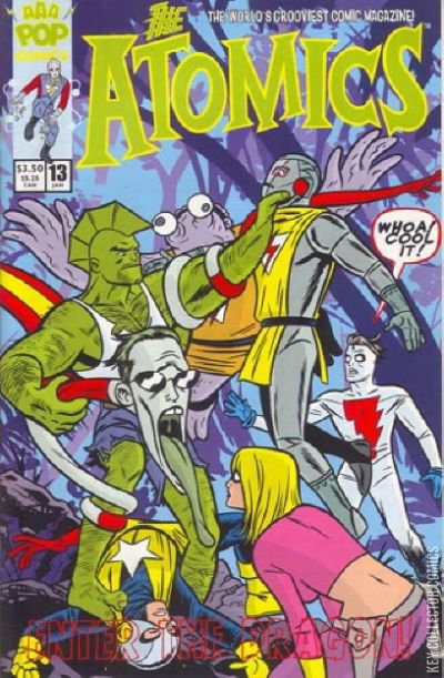 A whole new adventure begins as The Atomics are propelled into the savage world of the Savage Dragon! This is a great place to jump on as the group begins anew with official member, Frank Einstein (Madman) inducted into the team. Can you count how many writer/artists are regularly publishing a monthly color comic? Well, you'd certainly have to be counting Erik Larsen who has been leading the way for almost a decade with one of the most enthusiastically produced comics in the world, The Savage Dragon! And guess what gang?! The big fin-headed green guy is shaking things up in this very issue as The Atomics literally stumble across the Dragon when they find themselves stranded in his topsy-turvy world. This issue guarantees cover-to-cover thrills along with all the surprises and goodies you've come to expect from AAA Pop Comics!
