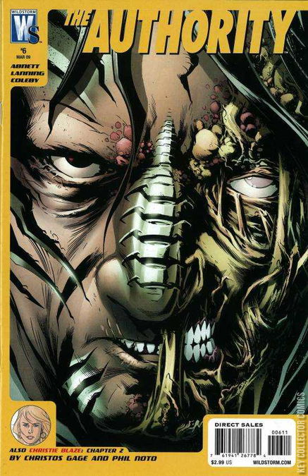 "Authority: World's End - Part 6" Angie and Swift are chasing a man through The Carrier. Midnighter easily takes the man down but Swift asks Midnighter not to harm the man until they can get some information out of him. Angie finds a necklace the man had with a lightning bolt symbol on it. As Angie tries to figure out where she's seen the symbol before, Jackson King, Christine Trelane, Winter, Hellstrike, and Fuji of Stormwatch teleport in front of her. Surprised and angered by their presence, Angie questions why Stormwatch took so long to contact them. Then she realizes the man they were chasing was a Stormwatch spy. Christine explains that they only came to work in cooperation to help alleviate some of the problems both teams are facing. Before she can continue, Jack Hawksmoor who apparently had been listening to the whole conversation, decides he's heard enough and leaves. Jackson King heads after Hawksmoor. Angie discusses with Christine what they need; starting with the fact that Apollo is currently missing. Swift also asks if Stormwatch knows about Rendelsham. Meanwhile at Rendelsham, Lorenzo is enjoying a cup of tea as he observes The Golden. There are only two of The Golden now and Lorenzo watches as they scan the "Door" out into the ether looking for their lost sibling. The man called Hawthorne approaches Lorenzo with a report about one of their scout teams that has gone missing. Lorenzo looks at the report and decides they're going to need help with this one. King catches up with Hawksmoor and tries to convince him they can still save the world. Hawksmoor is convinced it's too late but King offers to give The Carrier some power which will turn it into a city again. He leaves Hawksmoor to think about it. Christine Trelane reviews with Angie what steps will be taken now that they are working together. First, Midnighter and Fuji clear some of the abandoned sections of The Carrier in preparation for refugees from Skywatch III. Then, one of The Carrier's spires is turned into a functional power conduit. Skywatch III will regularly beam down energy to The Carrier as the space station's reservoirs peak. The Carrier comes alive once again. Unfortunately, it does not go unnoticed by Eidolon. Eidolon and his army waste no time in attacking the newly powered Carrier. Stormwatch and The Authority rally together to defend The Carrier. Deathblow and Flint teleport in from Skywatch III to join the battle. Angie and Christine monitor the battle from within The Carrier. But Eidolon appears before them claiming that his army was only a distraction. He incapacitates Christine and chases after Angie. Without her powers, Angie cannot defend against Eidolon. As she tries to escape she begs the nanotechnology lying dormant in her blood to activate. Eidolon loses sight of Angie but tracks her down and prepares to kill her. But when he finds her, he discovers that her nanotechnology is responsive again. Angie stands before him in full battle mode as The Engineer.