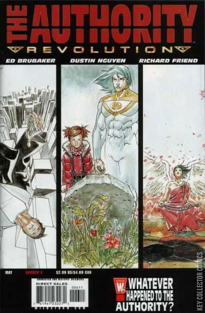"The Eternal Return Part 6 of 12: Whatever Happened to The Authority?" Three years have passed since the destruction of Washington, D.C. News shows recount the history of The Authority: from their days as Earth's protectors, to the team's celebrity phase, and finally to their phase of government dictatorship. But the question that lingers in the minds of Americans is simple: Whatever happened to the Authority? The nation's capital has been rebuilt with a memorial for those who died, and the Washington Monument has been reconstructed. Everything has been rebuilt or is in the final stages of construction, but The Authority is nowhere to be found. Midnighter drowns his sorrows at a bar in Moscow. He then heads out to an alley to bust up a weapons transaction between Russian hoodlums and aliens, who are attempting to acquire a device that obliterates all organic matter within a 10-mile radius. Midnighter kills the Russian thugs. The aliens declare inter-dimensional immunity – which doesn't stop Midnighter from killing them, too, and leaving a bloody mess in the snow. The Engineer and Jack Hawksmoor live alone on the Carrier. The Engineer enjoys life's bliss by taking the Carrier on a joyride throughout the dimensions. Hawksmoor, still the King of Cities, takes out trivial foes in Tokyo for exercise. Apollo and Jenny live in San Francisco, and have made an agreement to provide Jenny's services to the government upon her maturity. At a monastery in Tibet, Swift recommits herself to pacifism and meditation. She has not given an interview in two years, and protects her privacy at all costs. One night, Apollo visits Swift, and the pair flies around the peaceful Tibetan skies. Apollo invites Swift to The Doctor's memorial service to meet with Jenny, but she refuses to be seen in public. Rumored to have reverted back to his addictive ways after the dissolution of his churches, The Doctor, whose full name was Jeroen Thorndike, reportedly died of a drug overdose. However, a new Doctor has yet to appear on the scene as it clued from a surprising peace accord between Israel and Palestine, which is unusual, as a new Doctor typically replaces one that dies. At The Doctor's grave, Jenny and Apollo lay flowers. The press hound them for information on the other former members of The Authority. They ask about Midnighter, in particular. Jenny suddenly disappears. Apparently, her proximity to Jeroen's grave has given her access to The Doctor's Garden of Ancestral Memory. Jenny meets Jeron's predecessor and asks to speak to Jeroen. But to her surprise, she is informed that Jeroen is not in the Garden, which could mean that he's not dead. Jenny frantically returns to The Doctor's grave site to stand at Apollo's side. In the end, a series of news interview with random people express their opinion on the disbanded Authority, in which some of them, surprisingly, reveal that they missed and favored the team.