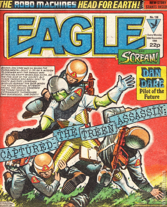 1st appearance of Leader-1, Cy-Kill, Robotron and the Robo Machines (known as the Go-Bots in the US) The Robo Machines (part 1) (Tom Tully - Mario Capaldi) There were 36 books featuring the Robo Machines and the story ran between issues 138 and 175. The plot has significant differences from the Challenge of the Go-Bots cartoon series that aired in the US. Doomlord - The Populators of Pollux (part 11) (Alan Grant - Eric Bradbury) The Fists of Danny Pyke (part 57) (John Wagner - John Burns) Thirteenth Floor (part 26) (John Wagner/Alan Grant - Jose Ortiz) Dan Dare - Pleasure Planet (part 8) (Ian Kennedy) Monster (part 26) (John Wagner - Jesus Redondo) Bloodfang - series two (part 10) (John Wagner - Carlos Cruz) One-Eyed Jack (part 69) (John Wagner - John Cooper)