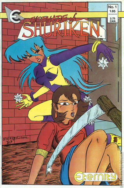 The Blade of Shuriken. Story by Reggie Byers. Art and cover by Reggie Byers and Robert Durham. Eternity takes over the publishing of Reggie Byers pioneering English-language manga comic featuring Martial-arts expert Kyoko Shidara. This series is modeled after shonen, or action-oriented boy's manga, while the original Shuriken series was based on shojo (girls) manga. Having abandoned her corrupt former employers, Kyoko Shidara, aka Shuriken, goes into business for herself as a bodyguard. 32 pages, B&W. Cover price $1.95.