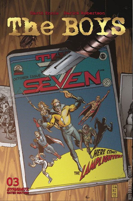 A special printing of The Boys #3 - featuring the first appearance of Starlight! This issue has never before been printed by Dynamite and is available for the first time, making this important issue, as part of a limited offering. Don't miss out! Written by Garth Ennis; Art and cover by Darick Robertson. Things heat up as Wee Hughie gets his first taste of action with the Boys when Butcher throws him into the deep end. Meanwhile, meet the planet's mightiest heroes, The Seven, and the young superheroine who would join them.