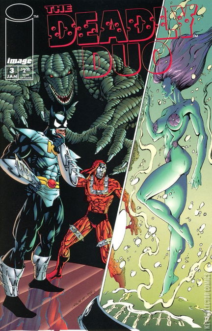 Cover pencils by Andy Smith, inks by Randy Elliott. Untitled story, script by Erik Larsen, pencils by Andy Smith, inks by Randy Elliott; Roman hunts for Maneater and the kidnapped Atlantean women; origin of Kill Cat.
