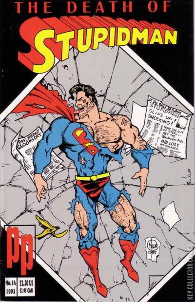 Cover 1A (banana peel) by Bill Maus. Stories by Don Chin and Bill Maus. Art by Bill Maus, plus a pinup by Mark Lewis. Another superhero spoof by the creator of Adolescent Radioactive Black Belt Hamsters and his publishing outfit, Parody Press. This one uses DCs Death of Superman mega-crossover event as a springboard to poke fun at 1990s comics in general, including inter-company crossovers, variant covers, bad girl/good girl art, and the inevitable return from the grave for most (male) heroes. During and after Stupidmans battle with Gloomsday (a monster made entirely of cereal), numerous heroes from DC, Marvel and Image make cameos, as well as, appropriately enough, The Tick. 32 pages, B&W.