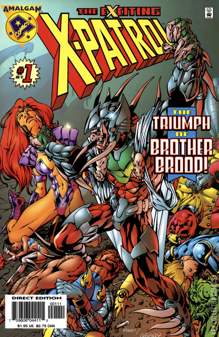 THE CURSE OF BROTHER BLOOD! In order to save two universes, the young hero known as Access was forced to use the power of Amalgam (see Marvel versus DC (1996) #3). In this issue, members of the X-Men, X-Force, Doom Patrol, and Teen Titans are merged to create Shatterstarfire (Starfire/Shatter Star), Niles Cable (Cable/Professor Niles), Beastling (Beast/Changeling), Ferro Man (Colossus/Robotman), and others must stand against the sinister Brother Brood (Brother Blood/the Brood).