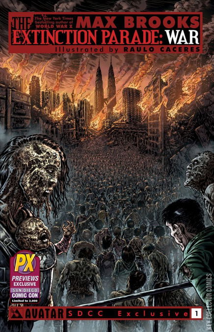 Jump on here, as the epic conflict continues right after Vol 1 with a super-sized battle issue! MAX BROOKS returns to the frightening world of zombies versus vampires in his groundbreaking follow up series: Extinction Parade: War! Well known for his breathtakingly original fiction, Brooks pushes the limits of the horror genre with his trademark meticulous research and vision for the next evolution in zombie storytelling. The subdead were always a joke to the aristocratic vampire race. Just a spec on the radar of their immortal lives, nothing worth even a moment's notice in their quest for self-gratification through the veins of their host, the human race. But at last they have been pulled from their ignorance into the reality of the world. The human race is facing extinction and should they succumb so too shall the vampires disappear beneath the waves of rotting walking dead. Extinction Parade: War opens the doors to the next violent chapter in Brooks' epic tale with an oversized issue starting the all-out battle for the survival of the races! Available with Regular, Wraparound, End of a Species, Leather, and Bloodwashed and Pure Art Retailer Order Incentive covers, all by series artist Raulo Caceres. Also, you won't want to miss the Deluxe Collector Set!
