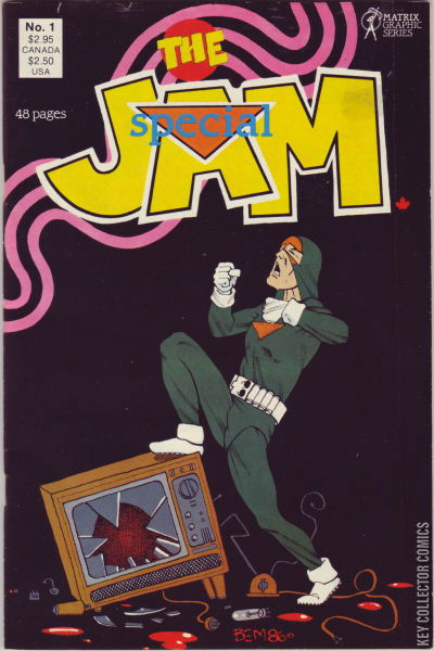 Seven stories in this one shot comic. Synopsis: Part One (Murphy's Lawyer): History of the publication of the Jam and a request to Marvel to give Jack Kirby his artwork back. Also includes indicia. Part Two (That Scream...): The Jam rescues Ms. Jane Marble (private investigator) from some hoodlums by yelling that she is his mother and generally acting strange. Part Three (Fight! Fight! Fight!): The Jam wrestles his dog on a rooftop, then stops an abusive husband. Part Four (Buvez Kik Cola): Gordie is returning bottles to a shop when it is robbed and he stops the robber. Ms. Jane Marble calls and offers him a one-time only job. Part Five (Momma Told Me...): Gordie goes out to call Ms. Jane Marble to find out more about the job, but while he is on the phone he overhears her almost getting shot and decides not to pursue the job. Part Six (Death!): Ms. Jane Marble is protecting the Blood King from the Flarks. The Jam helps David Brave with his brother-in-law. Part Seven (Man in outerspace being attacked by tentacles) Published by Matrix Graphic Series in 1987.