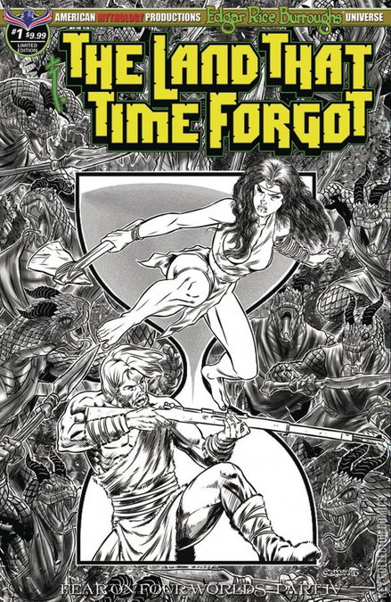 The dimension-spanning, four-part 'Fear on Four Worlds' storyline comes to a thunderous conclusion in the prehistoric world where it all began- The Land That Time Forgot! Edgar Rice Burroughs' greatest sci-fi worlds of adventure are all joined into one universe as Abby Tyler and Ethan Bradley battle their way back to their adopted home, the lost island of Caspak! But hot on their heels and out for blood are the voracious, flesh-eating, dinosaur-riding Horibs, the hideous lizard-men from Pellucidar, at the Earth's core! This issue comes with three covers - Main Cover by Mike Wolfer, Timeless & B&W Limited Edition Covers by Cyrus Mesarcia, and a Blank Sketch Edition.