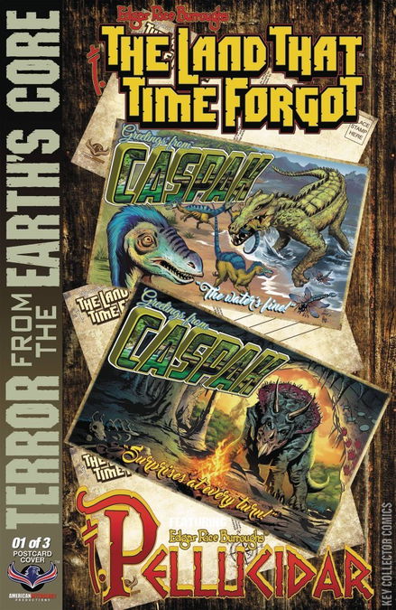 Two of Edgar Rice Burroughs' greatest science fiction series meet at last, as the lost continent of Caspak from THE LAND THAT TIME FORGOT and PELLUCIDAR, the prehistoric world at the Earth's core, collide in one colossal crossover! Stranded in time on the remote island continent of Caspak, Bowen Tyler, his future granddaughter Abby, the Galu warrior woman See-Ta, and the evil Baron von Schoenvorts and the crew of the German U-33 submarine have had their hands full fighting for survival against the rampaging dinosaurs of Caspak, as well as each other. But they are all about to be thrust into a war of worlds unlike anything ever seen, as the insidious inhabitants of Pellucidar find their way to the surface world, right in the heart of Caspak. The goal of the telepathic, prehistoric Mahars is the total subjugation of Caspak, a land that they seek to claim as their new kingdom, and with an invasion force of giant ants and an army of corpse-like, cannibalistic, subterranean creatures, they just might succeed! Officially licensed by Edgar Rice Burroughs, Inc., this is a series that any lover of dinosaurs, science fiction, lost worlds, and high adventure must not miss! The Land That Time Forgot: Terror From The Earth's Core comes with three covers - Two Connecting Main Covers by Mike Wolfer and a Wish You Were Here Postcard Retailer Incentive Edition by Dan Parsons.