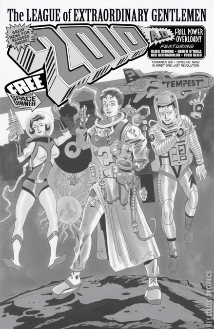 In Moore and O’Neill’s final comic-book, this issue masquerading as a British science-fiction weekly, the plot-strands of our concluding volume and loose ends from twenty years of continuity are tied in an ingenious starry bow, as Mina Murray and her legendary confederates transition from the world of fiction past and present to the world of fiction future. Planets end in visual spectacle, lovers are united in the matrimonial event of the millennium, and deadly enemies draw close in the conclusion of their fatal dances. This is your last call for the immaculate crescendo of The League of Extraordinary Gentlemen, Volume IV, The Tempest .