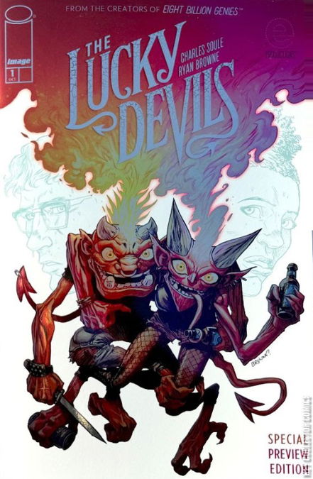MINISERIES PREMIERE Good Omens meets CURSE WORDS in this new series from the duo behind smash-hit EIGHT BILLION GENIES! THE LUCKY DEVILS is a tale of two rebellious demons who decide to start a revolution in Hell—and the two ordinary, 20-something humans they're going to manipulate to do it. A cheeky, satirical look at Good and Evil, THE LUCKY DEVILS_ _explores Faustian bargains and temptation in a rip-roaring, hilarious new way.