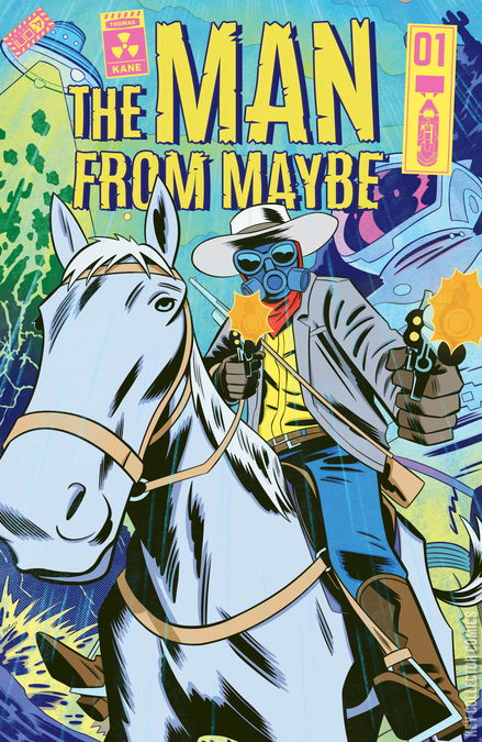 In the dry and dead future that's coming soon, all life belongs to Oppenheimer-obsessed billionaire Harvard Denny and his corporate scavengers from Smile, Inc., who pillage the wastelands in search of atomic contraband. As the race to acquire the a crashed spacecraft's cargo begins, our fate will be decided by a masked bandit and the cold iron of his laser rifle. He knows no name, no home, no surrender-only the whispered hush of those in need who dare call him . . . THE MAN FROM MAYBE! Give yourself over to an upside-down world where all mutants eat lead and all dinosaurs speak truth in the DOUBLE-SIZED, 48-PAGE debut of a postmodern, post apocalyptic epic of Western-infused action from rising star Jordan Thomas (Weird Work, XINO) and psychedelic warlord Shaky Kane (Bulletproof Coffin, The Beef) as the Man From Maybe sets his sights on THE CRATE OF DEATH!