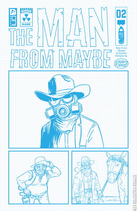 The wastelands are ablaze with cosmic peril! Beware! The hard, bad lands of the future are filled with danger even on the best of days! But how can even the toughest mutant rustlers compare to the terror of DINO-NAUTS hopped up on the trippy nega-mind substance that is . . . the Purple Claw?! The Man From Maybe rides hard, searching for revenge for his fallen comrades! Saving the wasteland from the machinations of malevolent billionaire Harvard Denny is just the cherry on top of this oil-slick sundae. Join Jordan Thomas (Weird Work, XINO) and legendary psychonaut Shaky Kane (Bulletproof Coffin, The Beef) as the Man From Maybe chases THE CRATE OF DEATH!