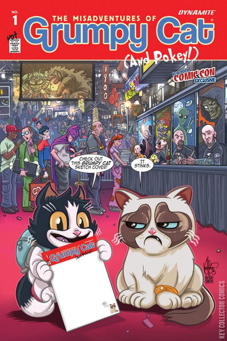 Dynamite proudly presents The Misadventures of Grumpy Cat #1, featuring "The World's Grumpiest Cat" and her brother, Pokey! With her ever-present pout and sassy disposition, Grumpy Cat has won the hearts of people everywhere. Grumpy Cat is the perfect combination of unbearable cuteness, instant fan appeal, and established multimedia presence. If you love the memes, the videos, and that irresistible scowl, then get ready for the wildly fun antics of Grumpy Cat and Pokey in Dynamite's all-new, all-sensational Grumpy Cat comics! Grumpy Cat's global following includes 7.6 million Facebook fans and over 31 million YouTube views. Since her photos first went viral in 2012, Grumpy Cat has gone from Internet star to real-life celebrity. She has two New York Time Best Selling Books, her own Lifetime movie Grumpy Cat's Worst Christmas Ever (voiced by actress Aubrey Plaza), has made numerous appearances including the MTV Movie Awards, American Idol, The Bachelorette, The Today Show, SXSW, Good Morning America, and even hosted WWE Monday Night Raw. Grumpy Cat is Friskies official "Spokescat", has filmed videos with Disney and Sesame Street, and appears in commercials for McDonald's and Honey Nut Cheerios.