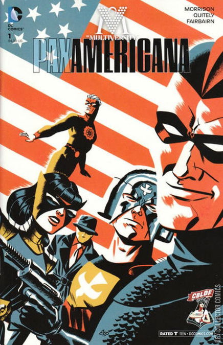 "IN WHICH WE BURN" Brace yourselves for the next exciting chapter of THE MULTIVERSITY as the acclaimed ALL-STAR SUPERMAN team of writer Grant Morrison and artist Frank Quitely investigate the conspiracy on Earth 4, home of Pax Americana! Told backwards through an experimental storytelling technique that reveals new mysteries with each turn of the page, PAX AMERICANA stars The Question, Blue Beetle, Captain Atom, Nightshade and Peacemaker like you've never seen them before! As the assassination of the U.S. president leads to political intrigue, interpersonal drama and astro-physical wonder, the truth behind the crime and those involved will blow your mind! What confidential conversation between the president and Captain Atom could reveal everything? How far will The Question take his hunt for the truth before he hurts his former friends - or himself? And who is the steel-handed bogeyman operating in the shadows? Discover all this and more in this exciting stand-alone issue which also acts as chapter four of the MULTIVERSITY storyline. Join us, if your dare, for THE MULTIVERSITY!