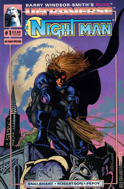 Cover art by Darick Robertson. Untitled Night Man story, script by Steve Englehart, pencils by Darick Robertson, inks by Andrew Pepoy; Intro and origin of Night Man; Johnny Domino survives a car accident; When walking home from the hospital, he can hear a man's thoughts that indicate he wants to kill a woman; Alarmed, Johnny believes he may be going crazy because of the hunk of metal that is still embedded in his brain, but decides to investigate this man in case he isn't insane; He follows the man to a restaurant and overhears the man set up a date with the waitress there for the upcoming Saturday; Johnny leaves the area and rushes home to decide what to do where he comes into contact with two burglars; Donning a costume, Johnny defeats the two burglars, proving to himself that he has what it takes to face a killer if he needs to. "C: The Sorcerer," script by Barry Windsor-Smith and Chris Ulm, pencils by Barry Windsor-Smith, inks by John Floyd; Rune origin, Part 3; Continued between Prime #5/Hardcase #5. "Second Chapter" starring Magnor, script by Mark Evanier, art by Sergio Aragones. Flip cover connects with 8 other October 1993 Ultraverse covers to form one image.