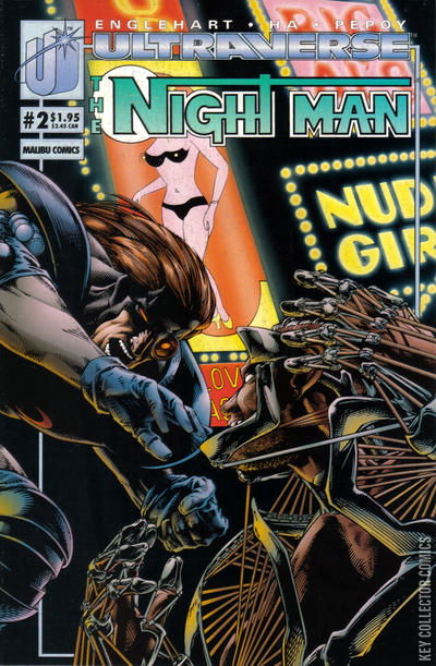 "Mangled" Night Man feels guilt and responsibility over the death of Ginger Robinson at the hands of Deathmask. He patrols the streets of San Francisco where he telepathically senses a crime. He comes across a man called Mangle, a severely disfigured man in an exoskeleton, trying to kidnap a young boy. Night Man is able to repel the attack and Mangle makes his escape while Night Man brings the boy back to his home. Night Man picked up some clues about Mangle, mostly about his hate for NuWare, and decides to visit the president of NuWare, J.D. Hunt, for answers. J.D. Hunt does not offer any information but Night Man learns that his son, Guy Hunt, is somehow involved with Mangle. Night Man warns Guy and learns that Mangle was Guy's former history tutor and that Mangle may be in a specific location. Night Man goes to the location to fight him but he again escapes and Night Man learns that there's more to this situation than he's been told. This story concludes in Freex #6