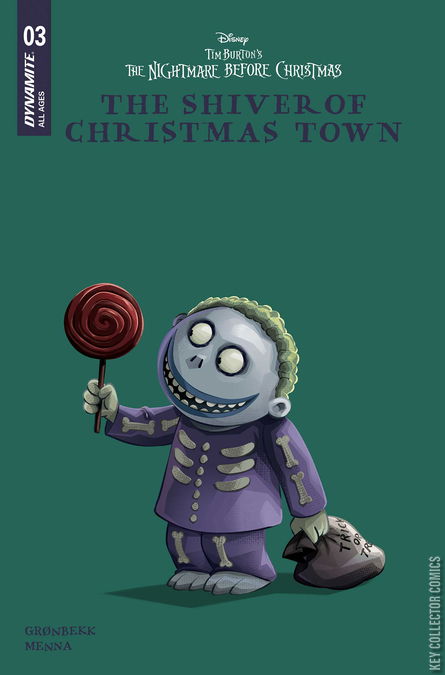 THERE’S A NEW KIND OF FEELING IN CHRISTMAS TOWN! With Oogie Boogie’s aggrieved ghouls hot on their tails, the mischievous trio of Lock, Stock, Barrel, along with Shiver, have arrived in Christmas Town to share their vast trick-or-treating knowledge with its inexperienced inhabitants. While the rosy-cheeked residents have got the basics down, their efforts at embodying the Halloween spirit definitely need some more bite. Luckily, Halloween Town’s pint-sized ambassadors have come prepared. In fact, they’re probably over-prepared — something that becomes painfully clear when Barrel unleashes the tricks that they’ve curated for this historic occasion. But as impressive as their efforts are, the scariest thing by far is the effect that the ghouls’ breakfast is having on Shiver! TORUNN GRØNBEKK and EDU MENNA’s jam-packed sleigh of a story begins to pick up speed in Tim Burton’s The Nightmare Before Christmas: The Shiver of Christmas Town #3 — all wrapped in festive covers from JAE LEE & JUNE CHUNG, SOO LEE, and ALAN QUAH, as well as a special selection from the Disney Library!