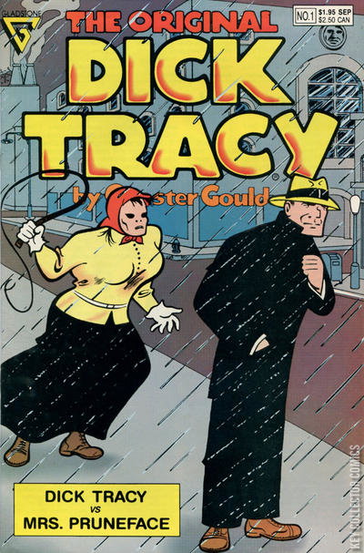 The Original Dick Tracy reprints original Chester Gould strips from the mid 1940s, cut and pasted to fit the comic book format. In "Dick Tracy vs. Mrs. Pruneface," the widow of Pruneface exacts revenge on Tracy for the death of her husband by putting him in a deadly trap. Includes biography of Gould by Shel Dorf.