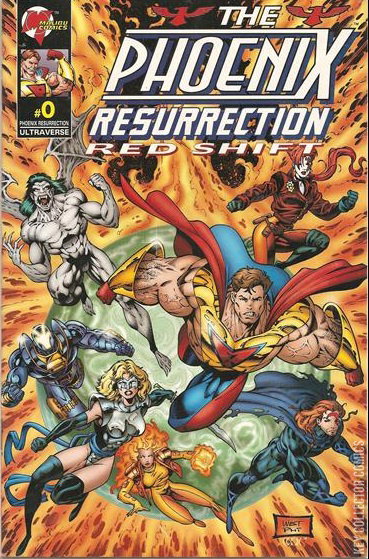 An Ultraverse title. Collected for the first time for the direct market: the seven introductory stories to The Phoenix Resurrection. These stories originally ran as back-up stories in November 1995 Ultraverse issues. Written by Ian Edginton and J. Smith. Art by John Royle, Phil Moy, Steve Moncuse, Paul Pelletier, Mark Farmer, Chuck Wojtkiewicz, Terry Austin, Randy Green, Gary Martin, Brian Murray and Rob Haynes. Plus: an all-new x-clusive chapter! Written by Ian Edginton and Dan Abnett. Art by Robert Stotz and Steve Moncuse. Cover by Bryan Hitch. Deluxe paper stock. American Entertainment exclusive comic with no cover price; Collects the Phoenix Resurrection stories that ran through the November 1995 Ultraverse books; This predates the regular Phoenix Resurrection #0 by 3 months and does not contain the original story that is present in the comic that was distributed through the direct market. Also titled "Red Shift" on the cover.