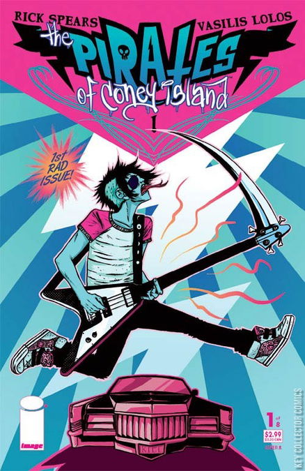 Rick Spears writer of the indie hit Teenagers From Mars and hot international artist Vasilis Lolos rock this riotous, teenage, romp through young love, car jacking and gang violence. In this first issue Patch arrives in Coney Island only to get his eye sliced out by Trish, the wicked bad leader of the girl gang The Cherries. Across town, Sal, a pizza-selling bookie, meets a nasty end delivered by a monstrous shadow with a shotgun. All the fun begins here in the first super-rad issue of The Pirates of Coney Island!