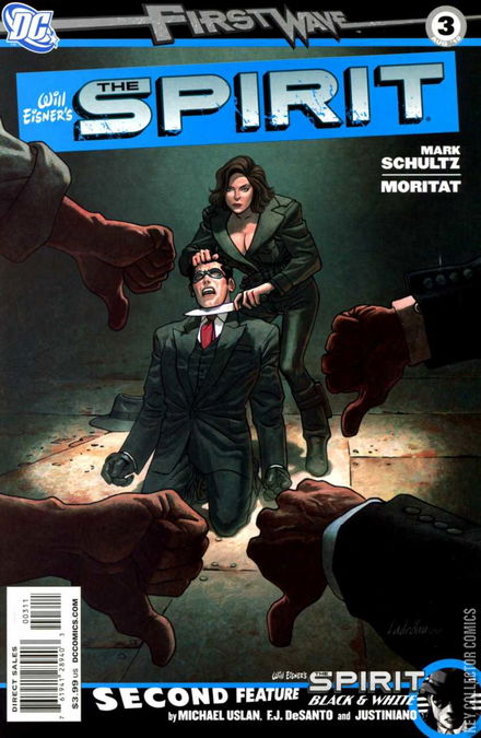 FIRST WAVE takes a break this month but THE SPIRIT marches on! Angel Smerti has delivered The Spirit into the deadly grasp of the Octopus, and the only one who can save him is... Angel Smerti?! Can The Spirit possibly warm her icy heart with a knife pressed against his throat? And in THE SPIRIT: BLACK & WHITE co-feature, Michael Uslan and F.J. DeSanto deliver a tale of treason on the airwaves, stunningly illustrated in rich graytones by Justiniano!