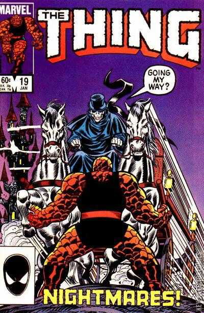 ROCKY GRIMM SPACE RANGER, PART IX (OF XII): MONSTER MASH And the tale he tells will keep you on the edge of your seat! Ben Grimm faces the flesh and blood incarnations of all the villians from the movies that ever scared him. Why do these creatures from the night come to haunt Ben now? The saga of Rocky Grimmtakes its strangest turn of all with "Monster Mash". This story continues in Fantastic Four #274 (January 1985) .